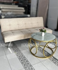 Bộ ghế sofa giường với chất liệu vải bố màu kem rất sang trọng, chất liệu vải bố dễ vệ sinh và đặc biệt là rất bền. Bên cạnh đó kèm theo 2 ghế đôn hình vuông và 1 bàn khoanh tròn sơn vàng giúp cho phòng khách của bạn sang trọng, tinh tế hơn