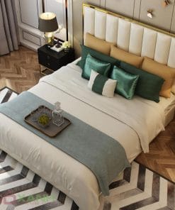 Công ty Gỗ Xanh chuyên nhận sản xuất, khách hàng có thể đặt hàng theo thiết kế của nhà mình, mẫu giường ngủ bọc nệm này cũng là một trong những bộ sản phẩm mới nhất tại Gỗ Xanh. Đầu giường đơn giản với phần khung bằng inox nhưng được mạ lên đó một lớp màu vàng nổi bật trên nền trắng kem làm cho chiếc giường luôn thu hút được ánh nhìn của mọi người. Sử dụng inox 304 chống gỉ nên nhiều khách hàng hay lo lắng sẽ bị gỉ sắt ăn vào phần chất liệu da bọc giường thì giờ đây có thể yên tâm đặt hàng Gỗ Xanh nhé. Đầu giường cũng được ứng dụng làm tựa lưng, được làm cộm lên bằng muss cao cấp không những đẹp mắt và sáng tạo mà còn giúp cho người sử dụng luôn luôn cảm thấy thoải mái khi ngồi.