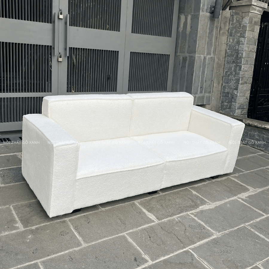 Sofa băng 2 ghế ngồi tay vuông làm từ vải lông cừu sang trọng. Chất liệu này có bề mặt bông xốp, mịn màng, mang lại cảm giác dễ chịu khi ngồi, tựa lưng. Bên cạnh đó, lớp vải dày đàn hồi tốt giúp nệm ngồi luôn êm ái, không bị cứng hay thô ráp. So với nhiều loại vải khác, lông cừu ít bị nhăn, không bai dão và giữ được vẻ đẹp nguyên vẹn như mới.