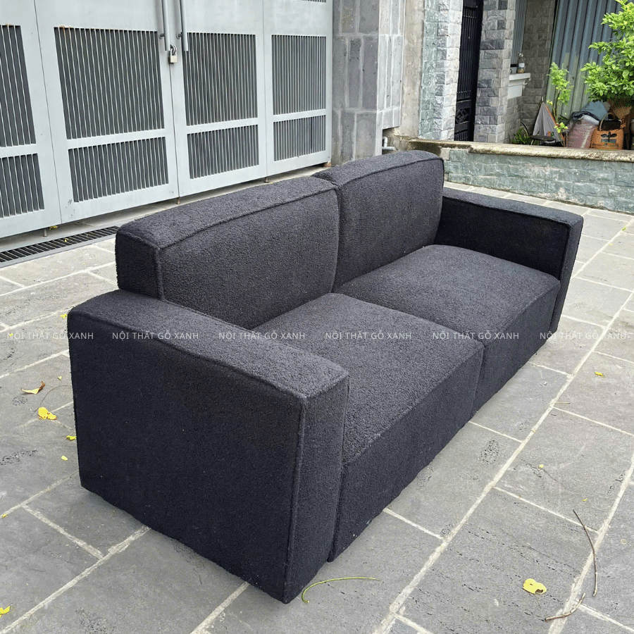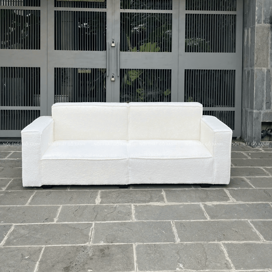 Sofa băng 2 ghế ngồi tay vuông làm từ vải lông cừu sang trọng. Chất liệu này có bề mặt bông xốp, mịn màng, mang lại cảm giác dễ chịu khi ngồi, tựa lưng. Bên cạnh đó, lớp vải dày đàn hồi tốt giúp nệm ngồi luôn êm ái, không bị cứng hay thô ráp. So với nhiều loại vải khác, lông cừu ít bị nhăn, không bai dão và giữ được vẻ đẹp nguyên vẹn như mới.